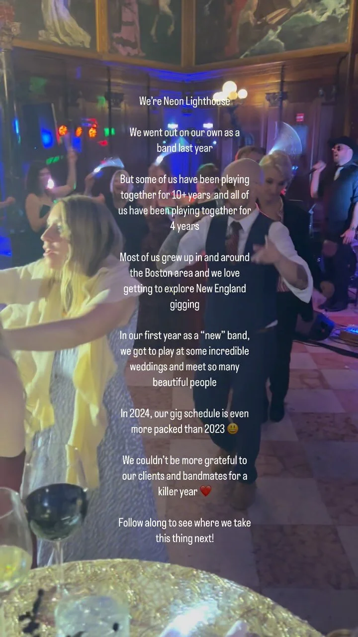 Neon Lighthouse blew us away! We told them we wanted a high energy dance floor rager and they totally delivered better than we could have ever expected. Our guests could hardly leave the dance floor to get a drink because each song was better than the next and no one wanted to miss a moment! The entire band is extremely talented and it was such a diverse and robust sound to have all members singing. The entire booking and planning process was also very smooth and they listened to our requests in advance and gave great advice. We had multiple guests asking for their card at the end of the wedding - which is the ultimate compliment as a wedding guest. A band makes a wedding and Neon Lighthouse MADE our wedding epic!